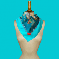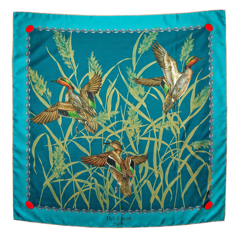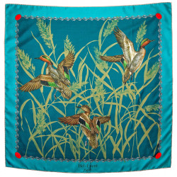 La collection exclusive des "sarcelles dans leur envol" a été dessinée dans l'atelier du Bel-Event en Normandie et imprimée à Côme chez l'un des plus grands professionnels de la mode italienne. Les foulards sont ensuite cousus à la main à Paris dans un des derniers ateliers traditionnels de haute couture. Un accessoire unique à l'allure romantique qui saura embellir tous les styles.