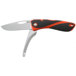 Ce couteau combine à la fois une lame lisse standard à une lame à éviscérer permettant d'enlever la fourrure de l'animal tué.