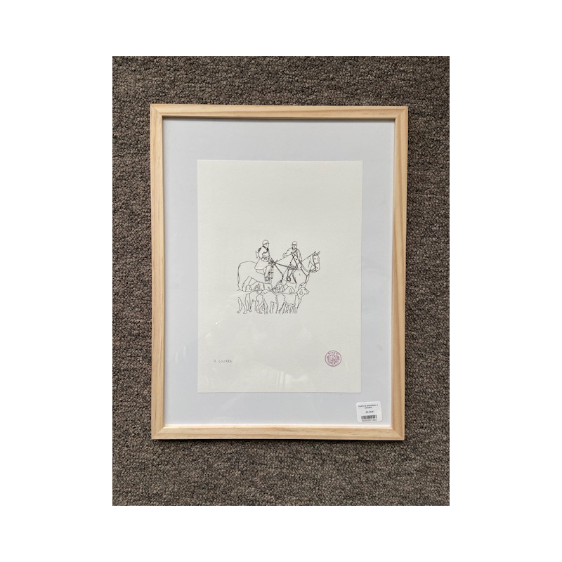 Une illustration encadrée représentant un panneau de chasse en cours.