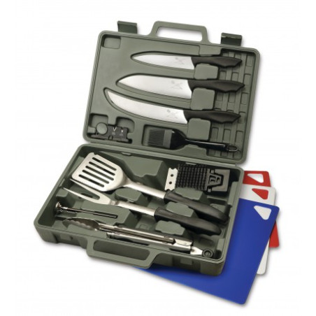 L'ensemble barbecue 14 pièces Cut-N-Que pro, emballé dans un étui de transport pratique comprend les outils dont vous avez besoin pour préparer et griller un délicieux repas.