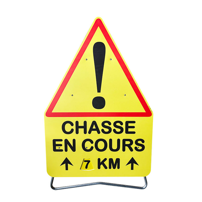 Le triangle de signalisation "CHASSE EN COURS" est un panneau signalétique que vous devrez apposer le long d'une route ou d'un chemin avant de démarrer une battue.