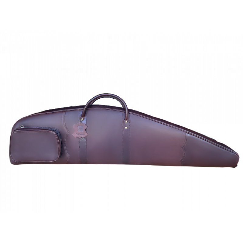 Cet étui fabriqué en cuir de vachette comporte un système de fermeture éclair de la plus haute qualité, sur toute la longueur de la housse. Un cadenas peut être attaché à la fermeture éclair pour transporter l'arme en toute sécurité. Il a une poche extérieure pour les munitions et une sangle de transport en cuir attachée.