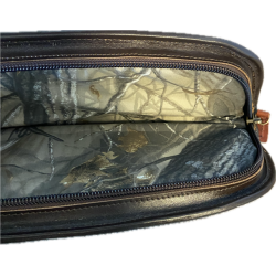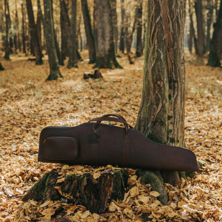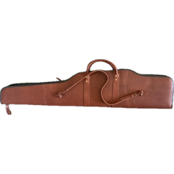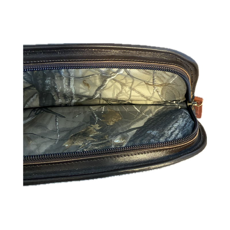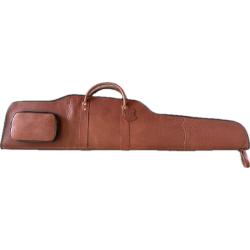 Cet étui fabriqué en cuir de vachette comporte un système de fermeture éclair de la plus haute qualité, sur toute la longueur de la housse. Un cadenas peut être attaché à la fermeture éclair pour transporter l'arme en toute sécurité. Il a une poche extérieure pour les munitions et une sangle de transport en cuir attachée. L'intérieur est en tissu de camouflage vert.
